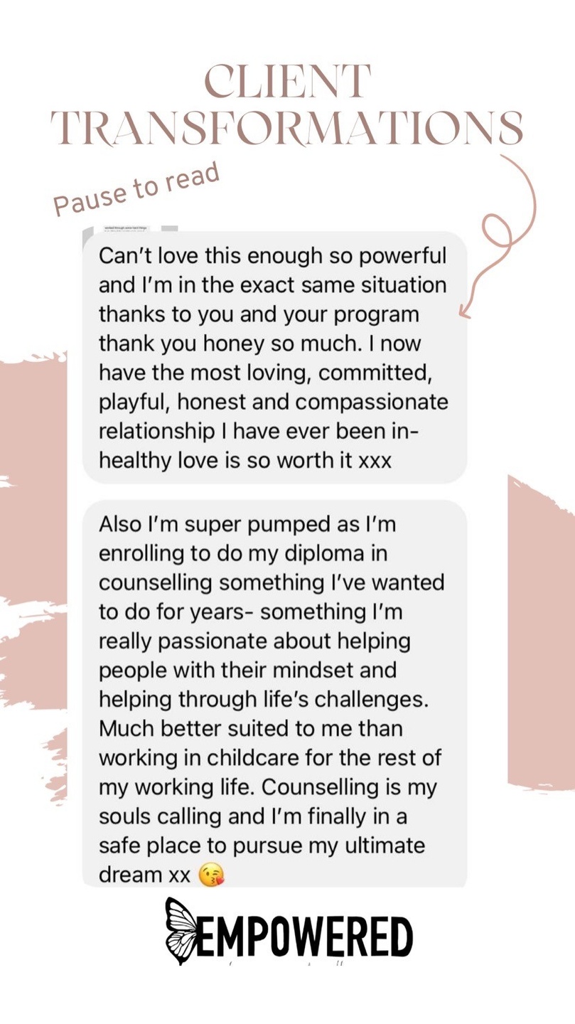 After running continuous rounds of Relationship Coaching Programs and my 14 years of personal experience, I have developed a powerful method that women coming knocking down my door for; one that allows them to heal at a deep subconscious level & step fully into their authentic power so they can walk away from what no longer serves them and become a magnet for the love they desire.